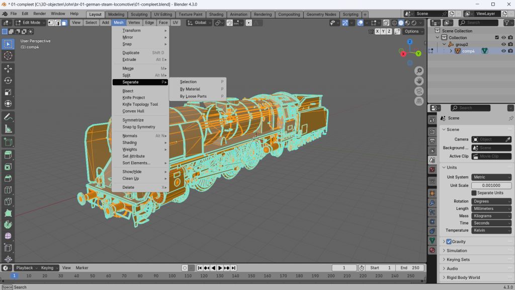 Vervolgens in het menu mesh separate>by loose parts. Waarmee het model in buikbare onderdelen wordt opgesplitst. Deze mooie functie in Blender werkt niet altijd! Het model moet eerder ook al uit losse onderdelen hebben bestaan. Als het model als één stuk is gebouwd kan het niet worden opgesplitst in losse onderdelen.